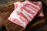 Raw pork ribs with spices, salt and rosemary on dark wooden background