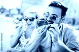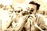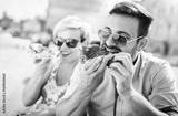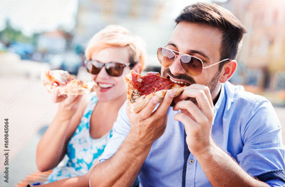 Couple eating pizza outdoors. Dating, consumerism, food, lifestyle concept
