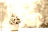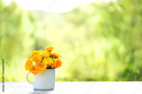 summer background. White enamel mug with bright orange flowers on table in garden, natural abstract sunny background. summer season. rustic composition with calendula flowers. copy space. soft focus