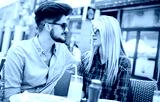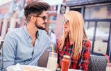 Beautiful young couple sitting in the cafe and eating pizza. Consumerism, food, lifestyle concept