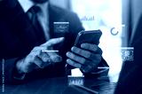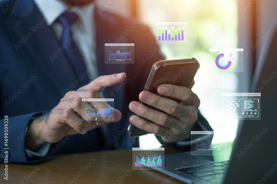 ฺBusinessman manages his business on smartphone while analyzing financial data, communicating with clients, and making quick investment decisions.