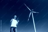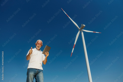 An old eco worker standing next to wind turbine with tablet in hands and giving thumbs up at the camera.