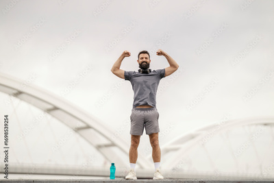 Bearded Athletic Man in Grey Sportswear Flexing Muscles And Celebrating Achievement