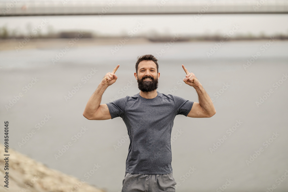 Bearded Male Athlete in Gray Activewear Posing by Waterfront Under Overcast Skies
