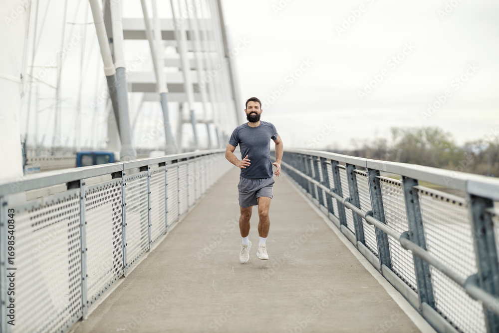 Male Runner in Gray Athletic Gear Jogging on City Bridge Under Cloudy Sky