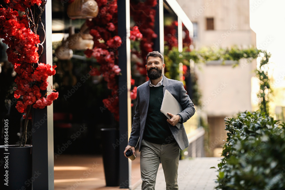 Three quarter length portrait of smiling businessman with laptop and takeaway coffee walking at business district towards camera.