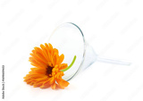 Herb flower Calendula in glass laboratory funnel isolated on white background. Symbol of homeopathic preparation. Concept of natural medicine.