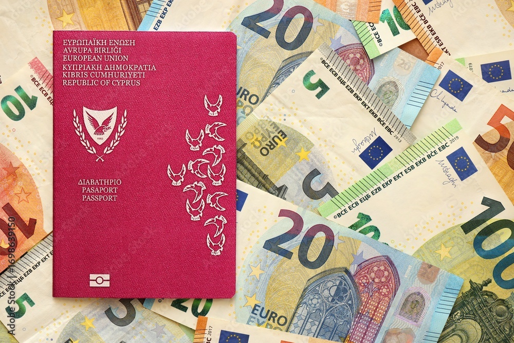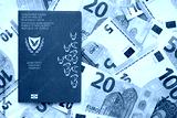 Kyprus passport lies on big amount of euro money banknotes. Rich life and travel in Europe