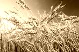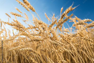 bakery products, farming, environment concept. beautiful heavy ears of rich golden wheat bending under weight of mellow seeds on the background of high blue sky