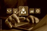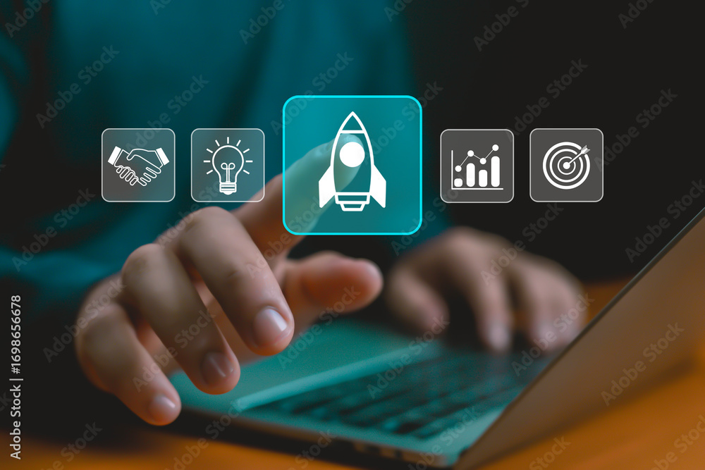 Business startup and innovation concept with digital icons of rocket launch, growth strategy, partnership, success, symbolizing entrepreneurship and new opportunities business start up, with speed