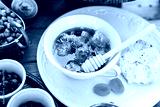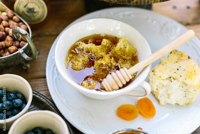 decoration, food, treat concept. front view of cup full of honeycombs ornamented with housebaked cake and dried apricot on the shiny white plate on the wooden table