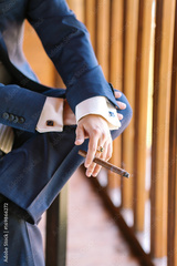 virility, solvency, business concept. close up of arms of young wealthy man wearing blue tweed suit with wondreful cufflinks, crossing his legs and smoking cigar