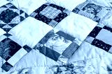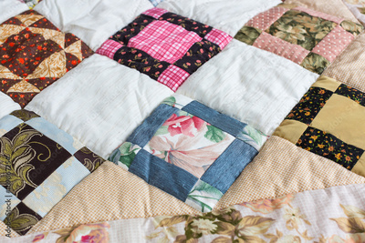 hobby, quilt, art concept. close up on piece quilt blanket patterned by a scattering of different geometrical figures such as triangles, squares and rhombuses