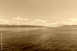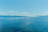 Sparkling blue sea under a bright sky with distant mountains and a small sailboat on the horizon