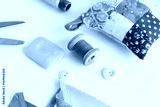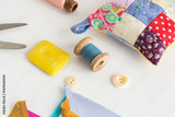 sewing, patchwork, tailoring and fashion concept - closeup tools on white desk in studio, pincushion, blue and pink threads spools, white buttons, scissors, soap, pieces of colored patchwork fabric