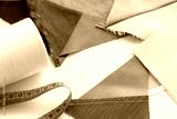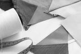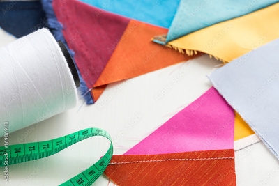 quilting, sewing, tailoring and fashion concept - macro of blue, gray, yellow, purple and orange stitched scraps of fabric, spool of white thread, close-up on beautiful patchwork, flat lay, top view