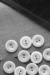 sewing, patchwork, tailoring and fashion concept - closeup on a scattering of some white buttons, macro over background of blue, gray, purple flaps of textile fabric, flat lay, top view