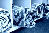 patchwork, sewing and fashion concept - some colorful finished quilted blanket in the studio at white shelves with few storage compartments, the warehouse of finished products, side view