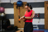 Smiling black woman checking smartwatch during fitness training in gym