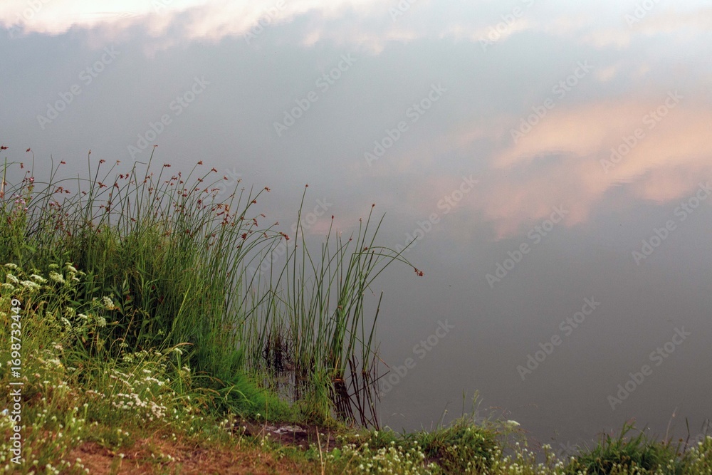 Lake shore with vegetation in summer.