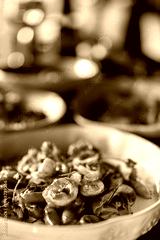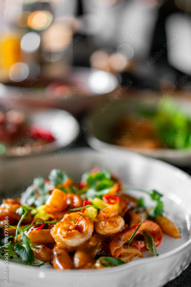 Close-up of stir-fried shrimp in glossy sauce, garnished with cilantro, red chili, and yellow vegetables, served in a white bowl. Vibrant Asian-style dish in restaurant setting