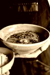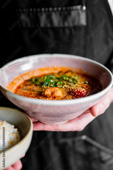 Close-up of a person holding spicy Asian soup and rice bowls, garnished with herbs and sesame seeds. Culinary presentation in a black apron, food styling concept.