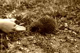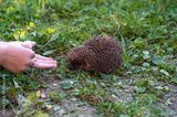 Child hand feeding hedgehog with piece of cheese outdoors in summer garden