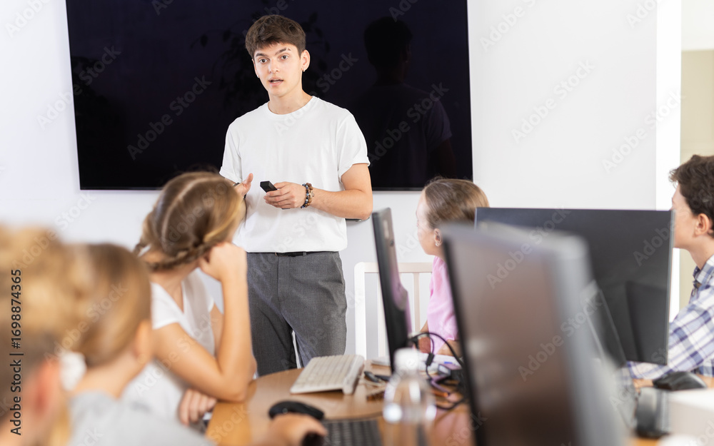 Young male trainer standing in front of black monitor and speaking to pupils during computer courses