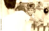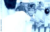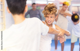 Focused kids in pair exercising self-defense movements during group class in modern sports studio, closeup