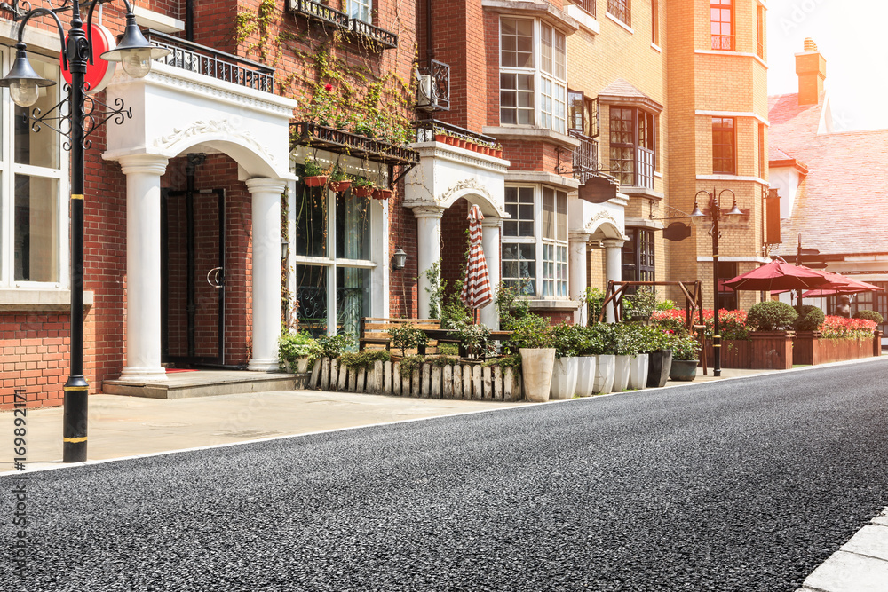 British style apartment building and asphalt road in the Thames town of Shanghai