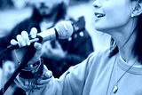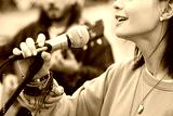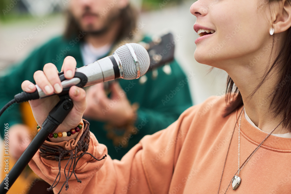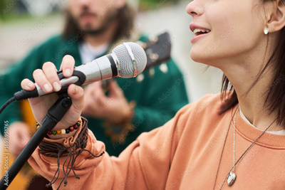 Young adult Caucasian woman singing into microphone outdoors with young adult Caucasian man playing acoustic guitar in background, both performing live music together