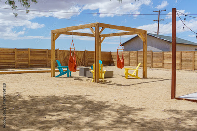 Swinging hammocks, chairs, firepit in wood pergola in backyard
