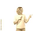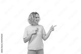 Woman dressed in pink happily pointing to the side, isolated, PNG