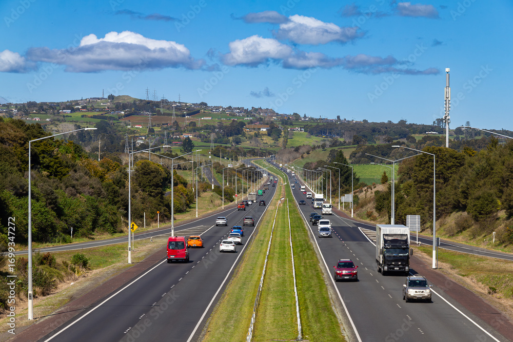 Auckland, New Zealand. Southern Motorway and Bombay Hills, north side, viewed from Ramarama. Boundary between Auckland and Waikato regions. Market gardening area. Remnant of extinct volcano.