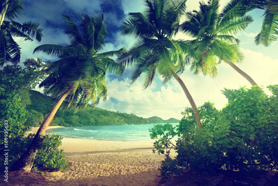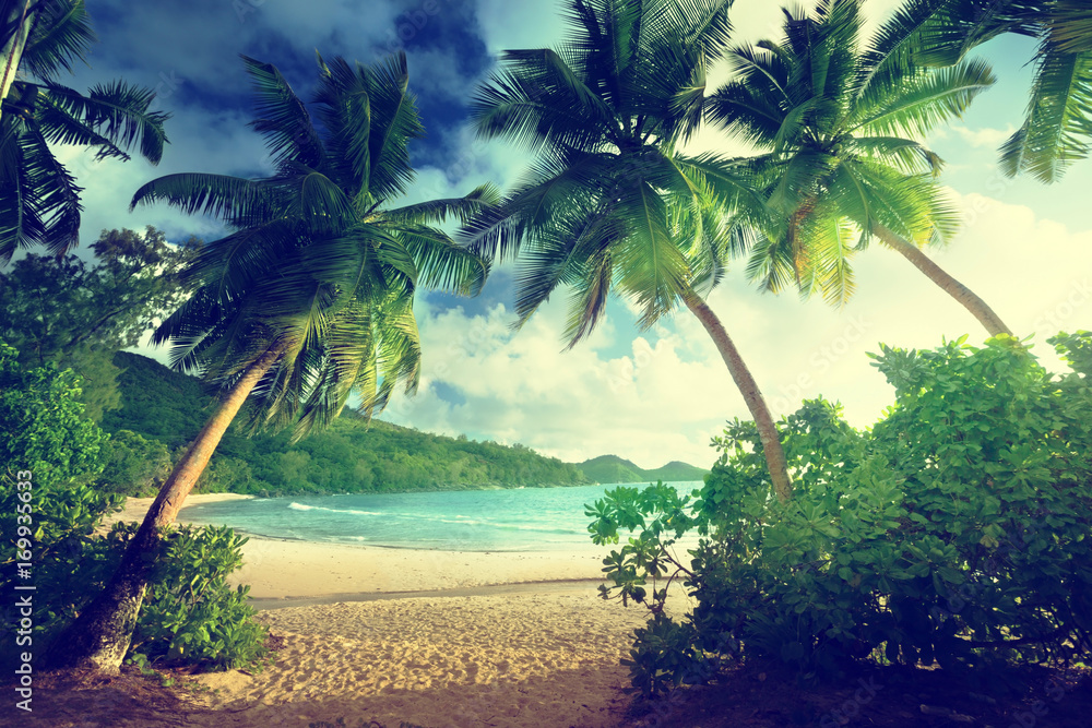 sunset on the beach Takamaka, Mahe island, Seychelles