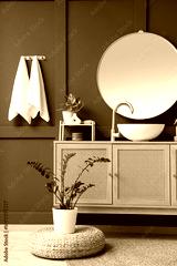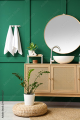 Modern sink, cabinet and houseplants near green wall in interior of bathroom