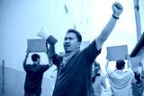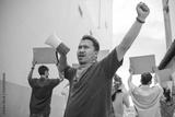 Asian Male Activist Using Megaphone To Amplify Voice And Raising Hands While Leading Group