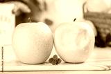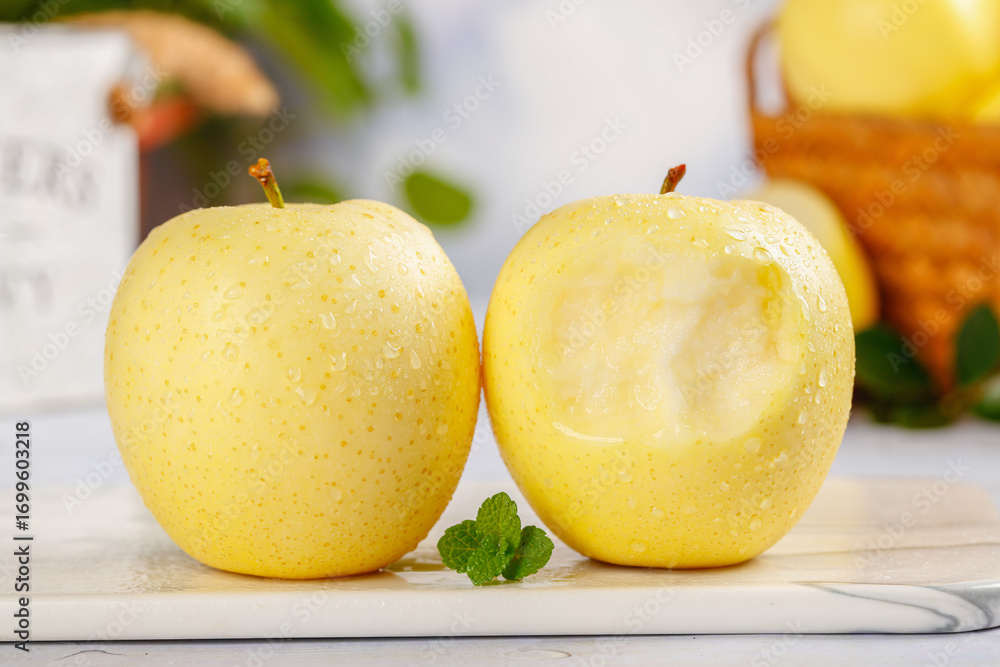 Fresh Golden Yellow Apples with Water Drops on Rustic White Wood Background