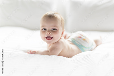 Cute happy 7 month baby girl in diaper lying and playing