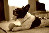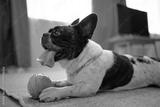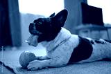 French Bulldog lying on carpet holding blue textured ball toy with mouth open and tongue out, looking to side in bright indoor setting, showing playful and relaxed behavior