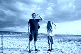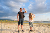 Dad and daughter are walking by the lake. The girl is looking through binoculars.