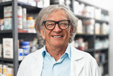 Smiling senior pharmacist in glasses at pharmacy