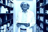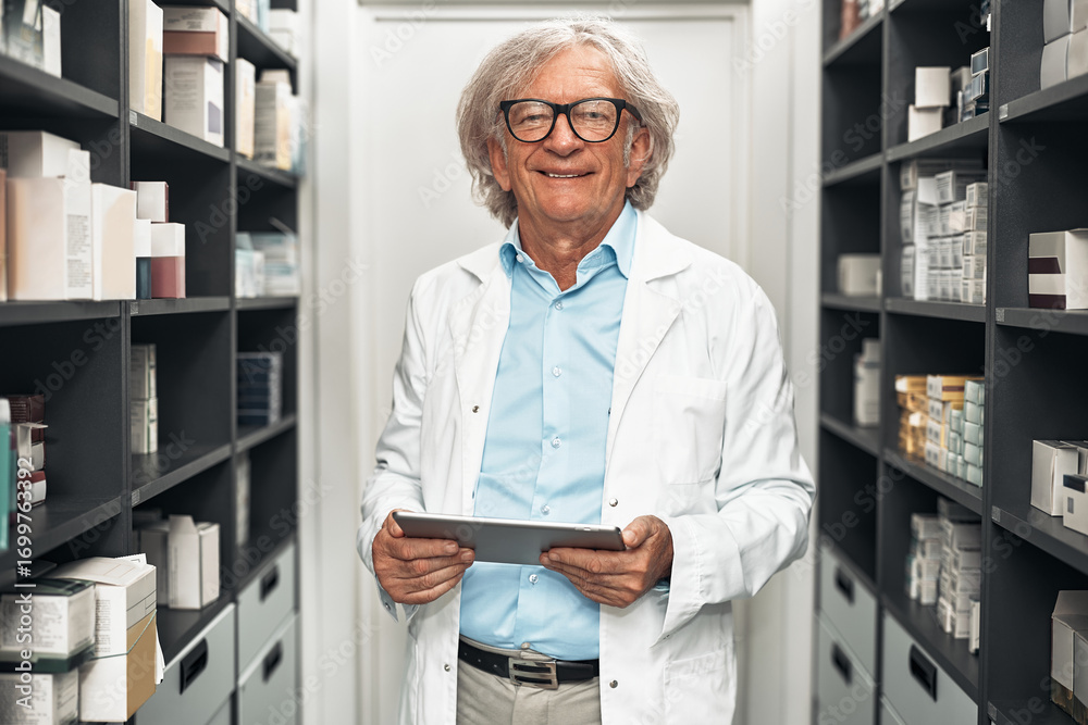 Senior pharmacist with digital tablet in pharmacy storeroom