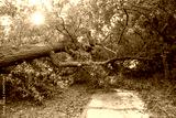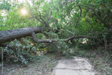 A large live oak tree uprooted by Harvey Hurricane Storm fell on bike/walk trail/pathway in suburban Kingwood, Northeast Houston, Texas, US. Fallen tree after this serious storm came through.