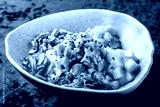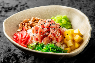 Colorful poke bowl with raw tuna, white rice, mango, seaweed salad, pickled ginger, peanuts, and bell pepper. Healthy Hawaiian cuisine on dark textured background.