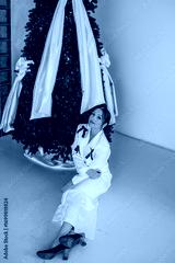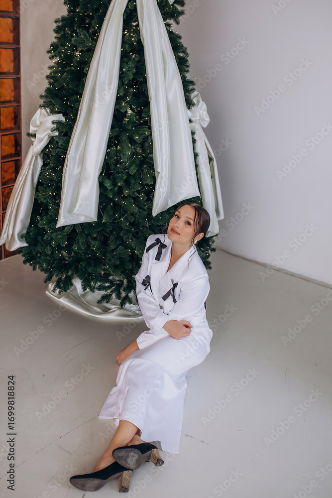 Beautiful elegant and stylish woman model brunette in white jacket and skirt at Christmas