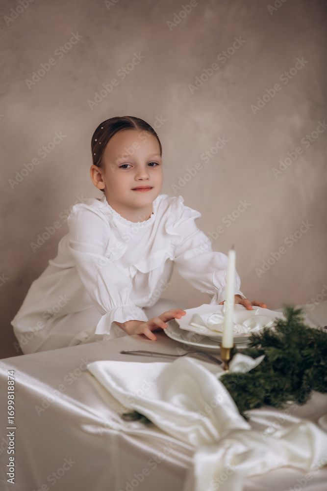 A beautiful and funny little girl child of preschool age at Christmas at a set table