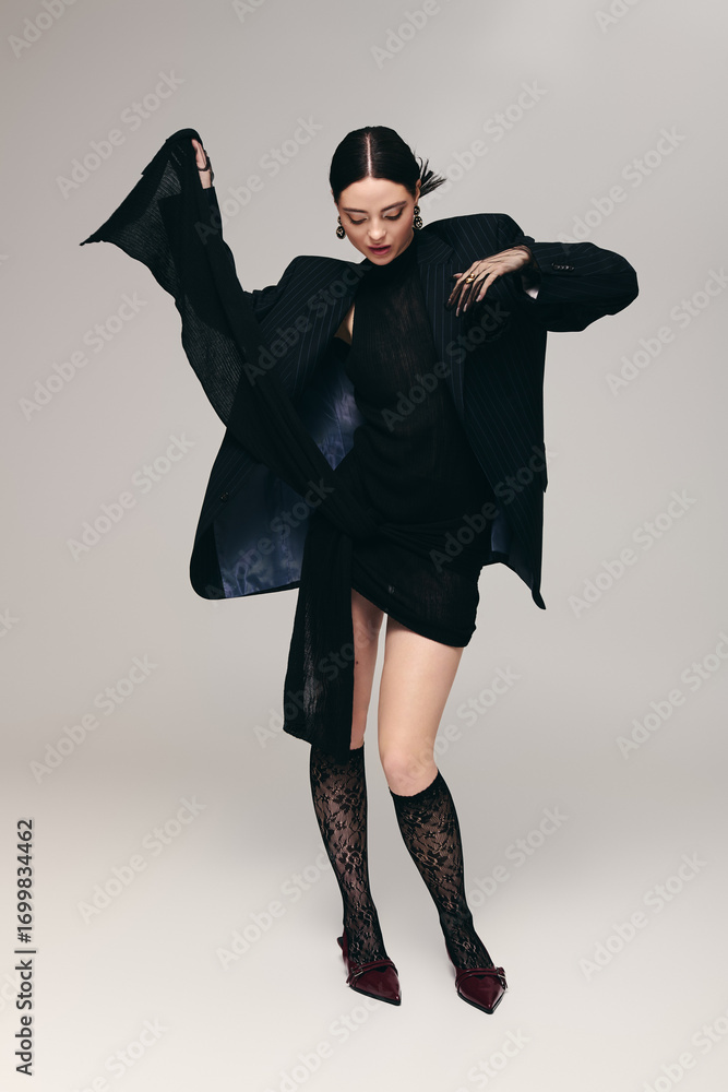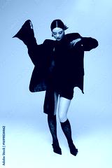 A young woman poses elegantly in stylish black attire and unique accessories in a studio.