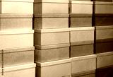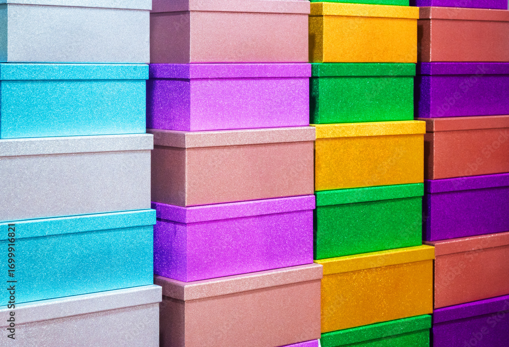 Vibrant, glittery gift boxes stacked in colorful columns, creating a festive background. Perfect for holidays, celebrations, shopping, or packaging themes, showcasing sparkle and variety.