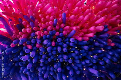 Vibrant abstract background of fuchsia and purple balloons intertwined with warm string lights, creating a festive, textured, and dynamic visual. Perfect for celebrations, art, or modern design.